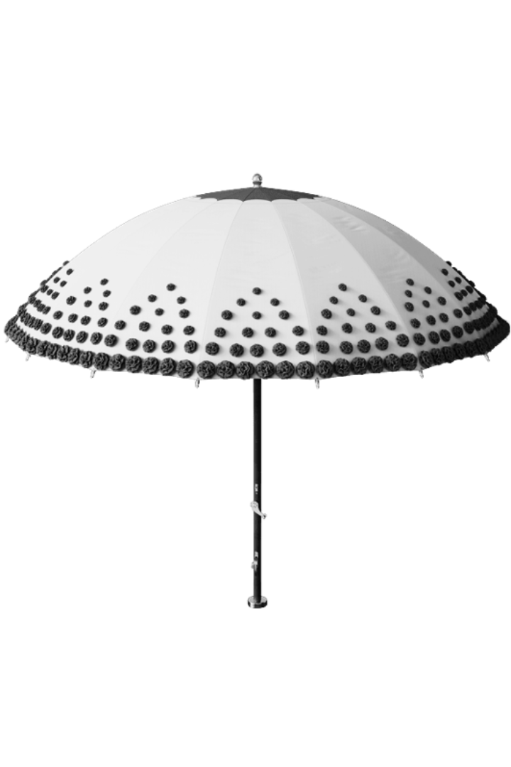 A show-stopping 12-foot umbrella featuring a sculptural black-and-white canopy adorned with textured rosettes. Its dramatic dome silhouette and bold contrast detailing make it a striking statement piece for outdoor lounges, poolside settings, and elevated event designs. Durable, elegant, and unmistakably chic.