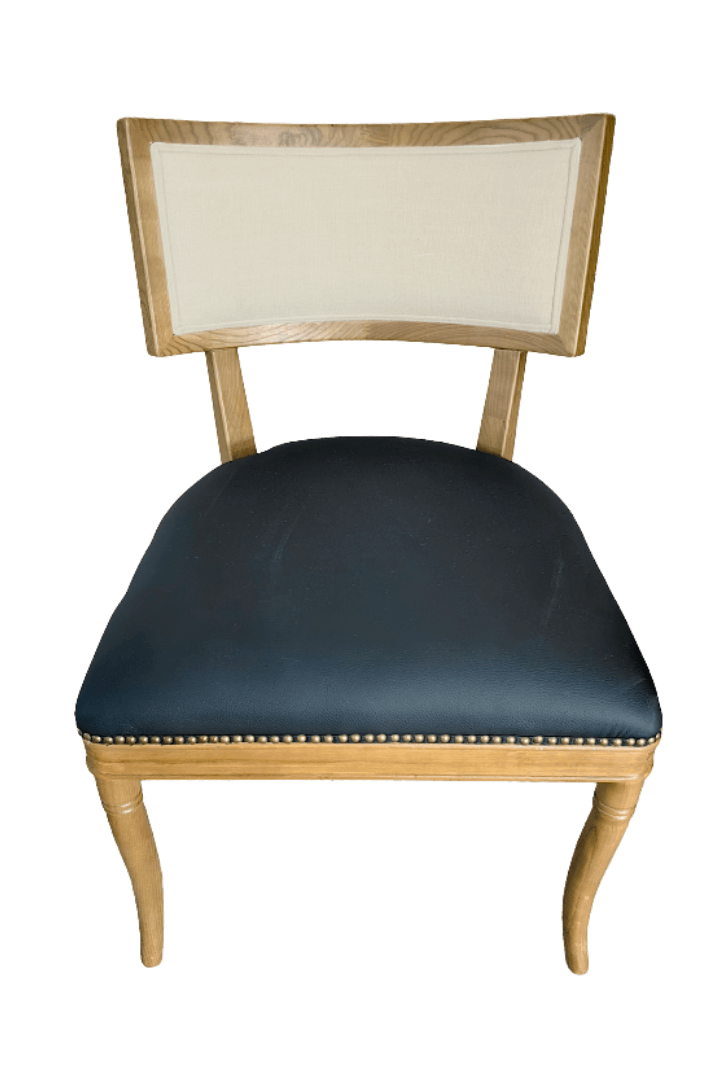 The Darcy Chair offers a refined blend of texture and tone, pairing a taupe linen back with a smooth black leather seat. Its gently curved wooden frame adds warmth, while the hand-applied nailhead trim brings a subtle touch of craftsmanship.