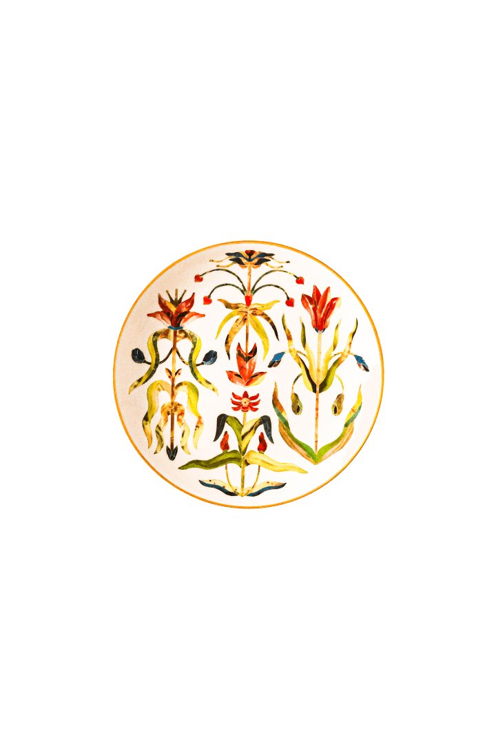 Inspired by European artistry and antique botanical illustrations, the L’Objet Grand Tour collection features vibrant, hand-painted florals framed with a refined golden rim. Each piece showcases intricate detailing and rich color, creating a table setting that feels both historic and effortlessly modern.