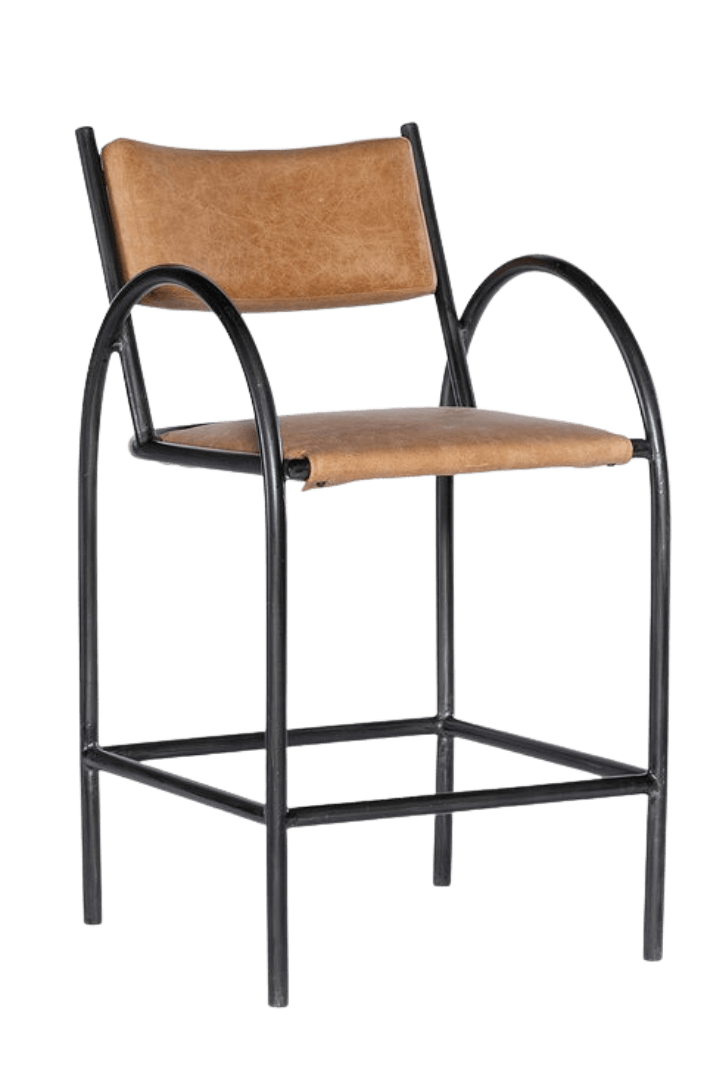 This barstool pairs caramel leather cushions with a black metal frame, creating a striking contrast. Its curved arms and minimalist profile make it a versatile addition to any modern bar or dining setting.