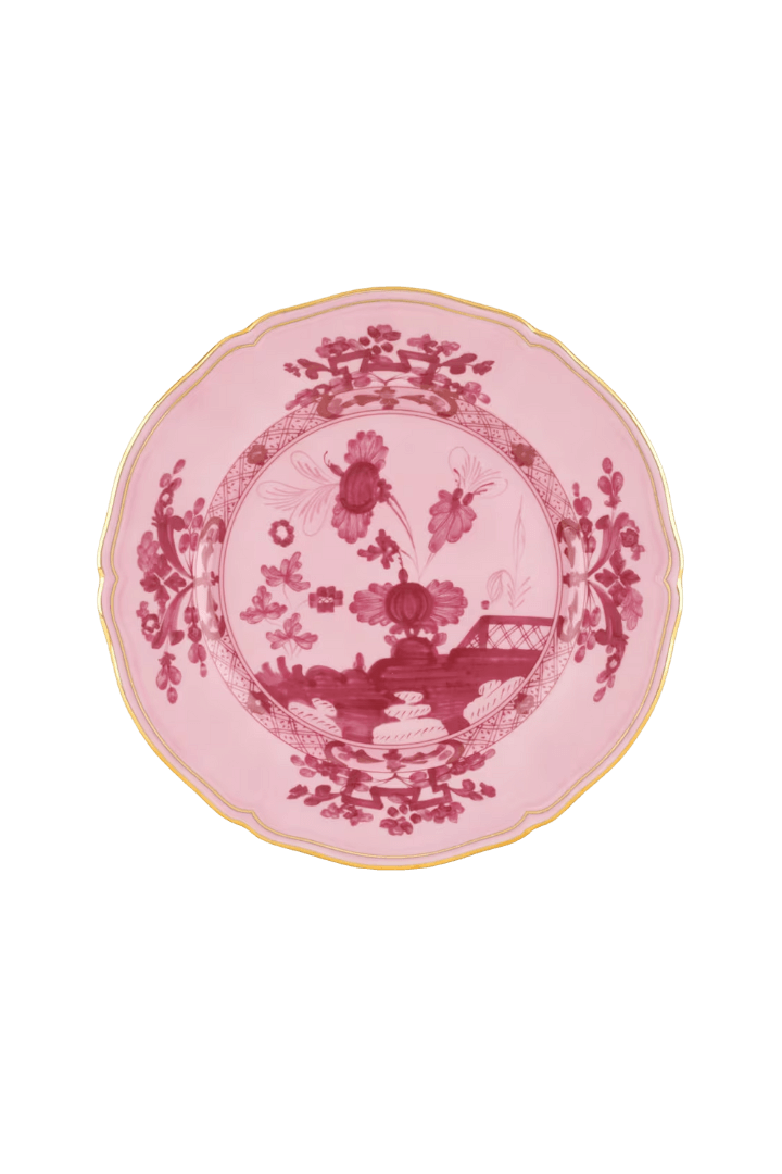 Exquisite gold threading, a hallmark of Ginori 1735, illuminates and enriches the design as it traces the classic contours of the iconic Antico Doccia shape. Porcelain colored an intense pink-purple accentuates the contrasting floral motif.