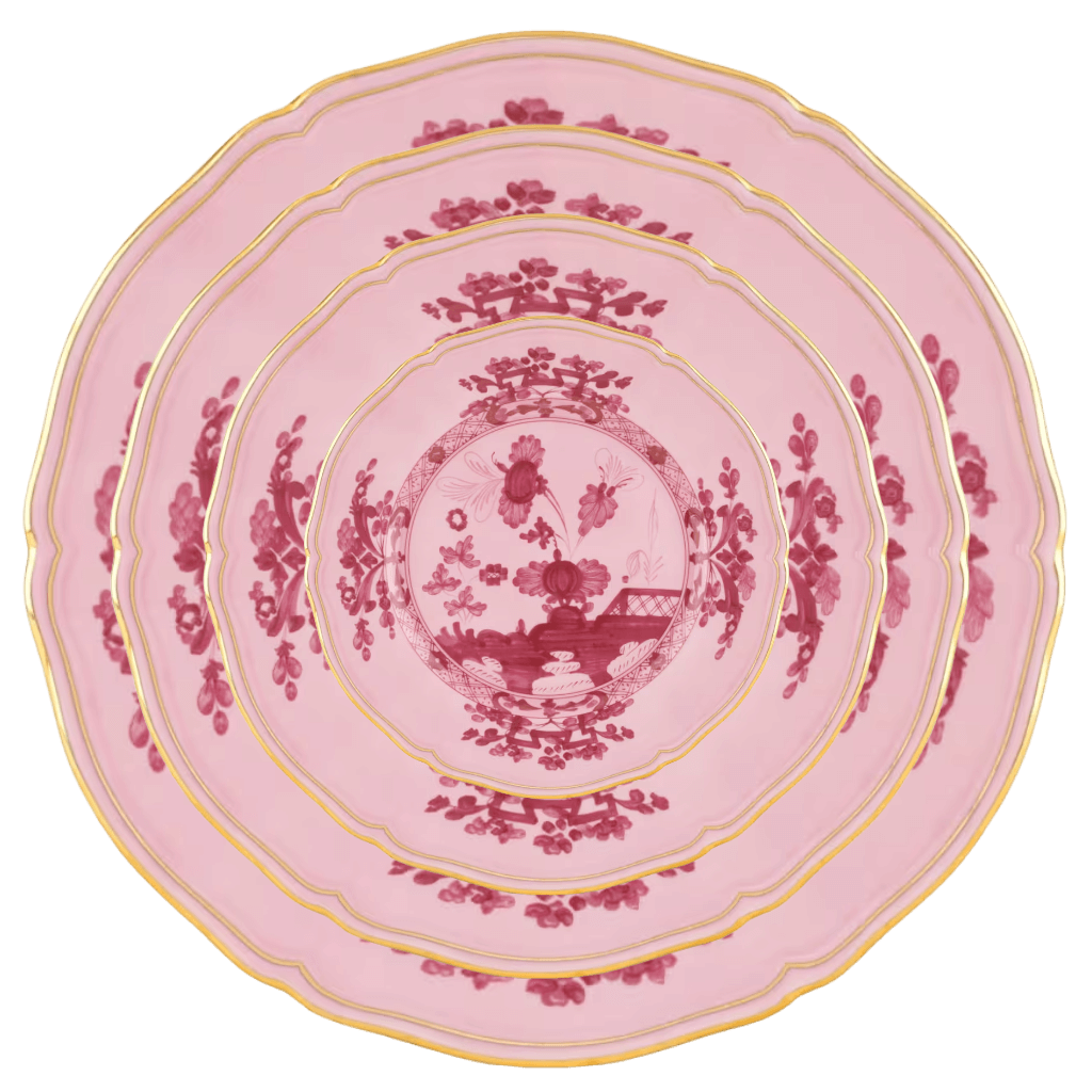Exquisite gold threading, a hallmark of Ginori 1735, illuminates and enriches the design as it traces the classic contours of the iconic Antico Doccia shape. Porcelain colored an intense pink-purple accentuates the contrasting floral motif.